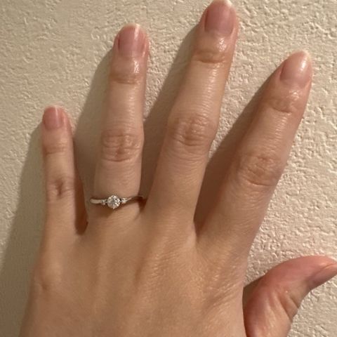 指輪のデザインがシンプルでとてもかわいいです。 キラキラではありますがそれほど、ギラギラしておらず、普段使いもできるのでとってもかわいいです! 色々な、指輪がありましたがこれが1番可愛かったです。 三つのダイヤが着いていてお気に入りです。