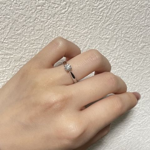 結婚指輪との重ね付けを想定し、シンプルなソリテールで6本爪のデザインにしました。 ダイヤモンドのクオリティを重視して選んだので、キラキラ輝くところを見るたびに嬉しい気持ちになります。 アームとダイヤモンドが滑らかに繋がっており、引っかかりにくくて使いやすいです。