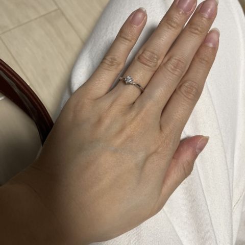 自身の指が綺麗に見える形の指輪で,つけ心地もとても良いです。ダイアモンドも綺麗に輝く様子がとても良いです!婚約指輪であるため今後重ね付けを考えているので、どのような指輪でも重ね付けしても綺麗に見えるデザインでお気に入りです。
