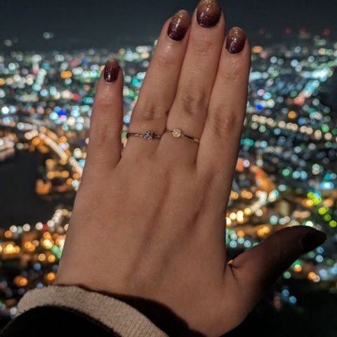 婚約指輪は彼と一緒に見に行きました。 結婚指輪と重ね付けをしたかったのでストレートデザインを選びました。また、リングが細いからこそセンターダイヤモンドが輝いて見えることが購入の決め手でした! 周りのダイヤモンドもキラキラと輝いていて一生大切にしたいなと思いました!