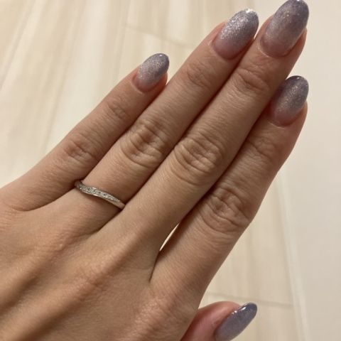 ダイヤモンドが複数ついていて、つけていると華やかに見えます。初めは、細くてシンプルなものを選ぼうとしていましたが、試着してみると自分の指をきれいに見せてくれるこの指輪に一目惚れしました。ウェーブもあり、年をとってもきれいに見せてくれると思い、これにしました。