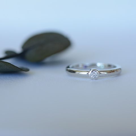 指輪はシンプルな物がタイプなので、おばあちゃんになっても着けれるような指輪を探していました。もともとサイトから知っていましたが、実物をお店で見たときはすぐ気に入りました。煌めくダイヤの見せ方が美しかったです。シンプルなので、どんな服装にも合うと思っています。そして結婚指輪も同じブランドなので重ね付けの見た目も気にして購入しました。