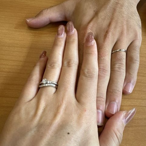 重ねた時に同じ位置にヘアラインを入れてもらいました。女性の指輪はダイヤの数も3,5,7個の奇数で悩みました。斜めに入るデザインなので勇気を出して5個いれてみました。ミル打ちを入れるか悩んでいましたが、実際の指輪をつけてこれくらいのシンプル、カジュアルな綺麗感がちょうどよく、いれなくてよかったと思いました。 サイズ感も入籍指輪を試せたおかげでピッタリと合い、プラチナにしたことで着け心地もすごくいいです。