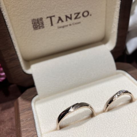 鍛造製造で傷つきにくく、歪みにくいとのことで結婚指輪はTANZO.で作ろうと決めました。デザインはダイヤの斜めの幅、上のみミル、コンビのデザインと、細部までこだわり続け、誰とも被らない指輪が出来上がりました。