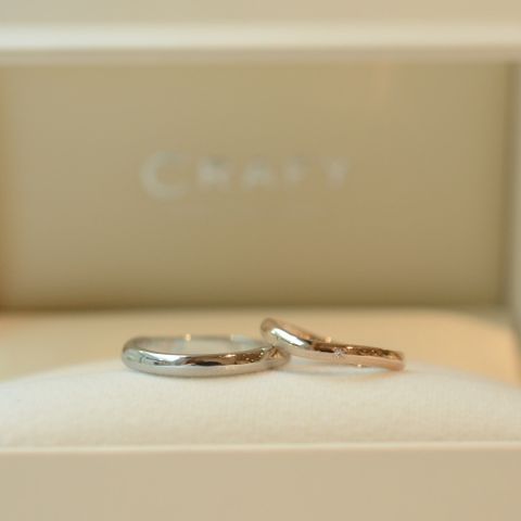 フルオーダーにしたので世界に1つ。珍しい色味の金属があり、自分たちの肌に馴染む色を選べたこと。 デザインについては事前に調べたものを上手く組み合わせてもらい、内側と外側で色を変えたり、ハートの刻印をしてもらったこと。