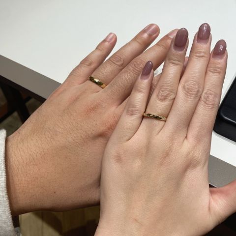 夫がプラチナ、私がゴールドという色の組み合わせだけ決めて探していたところ、デザインがシンプルなものがあまりなく、こちらの指輪を見つけたときにこれだ!と思いました。どちらも内側にダイヤが埋め込まれていて、さりげないデザインも気に入りました。光の加減で斜めの線が入るのでパッと見た感じも可愛いです。傷がつきやすいと説明がありましたが、それもまたナチュラルな雰囲気になってくるので全然気になりません。太すぎず、細すぎずなので違和感なく馴染みます。結果的に他のお店では一切見ずに購入しましたが、大満足です。