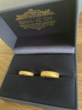 イエローゴールドで、キラキラしすぎないようブラシマットにし、丸みを持たせた指に馴染むデザインで、とても気に入っています。夫の方はグレイッシュゴールドで鏡面にしましたが、こちらもキラキラしすぎず落ち着いた輝きがあります。