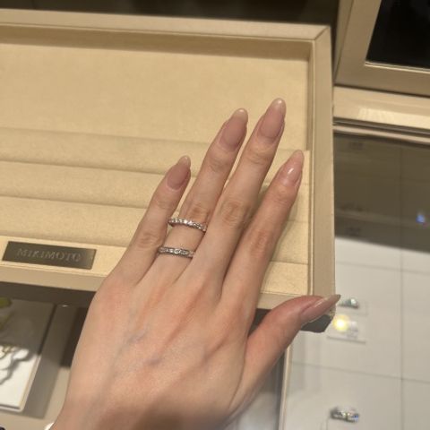 プリンセスカットの指輪が珍しく、その中でもハーフエタニティはかなり珍しいです。その中でカラット数も0.5カラットとふんだんにダイヤが使われている点も決めてになりました。またプラチナの指に当たる部分もとても滑らかでミキモトさんの技術の高さがうかがえました。