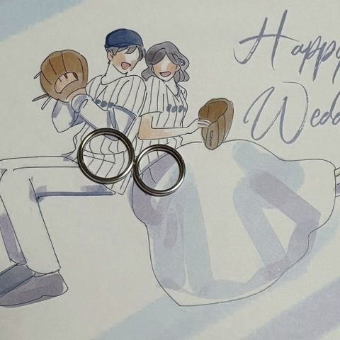新郎新婦でお揃いのデザインにしました。お互い派手なものは好みではないので、新婦のみ小さなダイヤを1つ付けています。ウェーブで指が長く見えるデザインがお気に入りです。2人の誕生石のエメラルドを内側に付け、イニシャル・記念日の刻印を入れていただき、とてもお気に入りです!