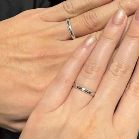 旦那が仕事上、華美なものがつけられないので、静かめに、かつ少し遊びがあるようなデザインがよく、この結婚指輪にしました。 私のリングも、ネイルやほかのリングをした時でも浮かないようなデザインで惹かれて選びました。