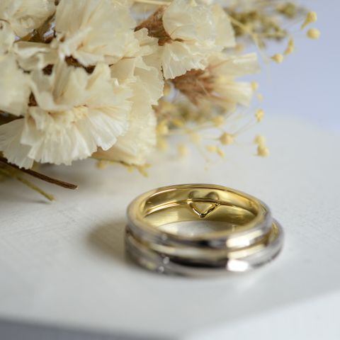 フルオーダーにしたので世界に1つ。珍しい色味の金属があり、自分たちの肌に馴染む色を選べたこと。 デザインについては事前に調べたものを上手く組み合わせてもらい、内側と外側で色を変えたり、ハートの刻印をしてもらったこと。