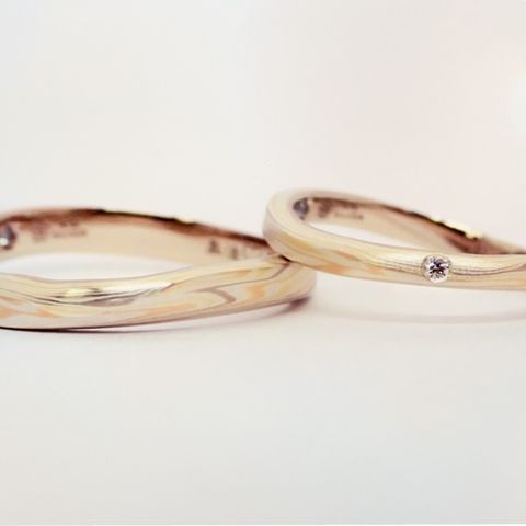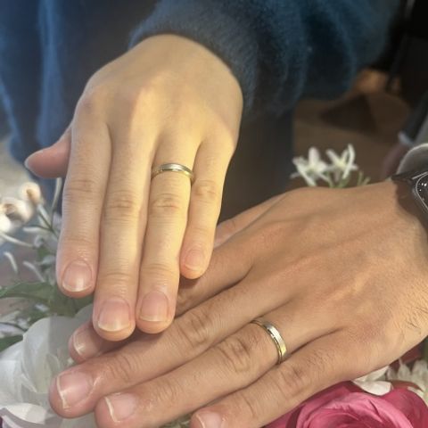 質感がなめらかで、ずっと着けていても心地よい。 しっかりした作りながらシンプルで、少し厚みがあるのがコロンとして可愛らしい。 ゴールドは色味が多く、お互いの好みや肌色に合わせて選びました。 デザインはイメージや印象を店員さんがしっかり聞いてくださり、また適切なアドバイスも頂きながら作る事ができました。