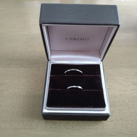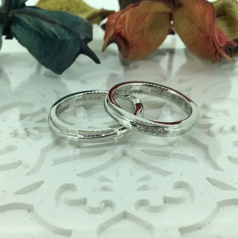 元々プラチナを素材にシンプルでどこでも付けれる万能でいて綺麗な指輪がいいなと思っていたので、それを参考に作りました。 妻がつける方にはダイヤが入っていて女性らしく、自分がつける方はあえてダイヤ無しでクセがない形にしました。