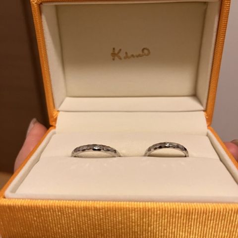 彼がシンプルな平打ちの指輪を希望していて、こちらになりました。既成のデザインから太さ等自分好みに変えてもらうことができ、より完璧なデザインになりました。 女性側もダイヤがついていて、なかなか他にないデザインなのでお気に入りです!