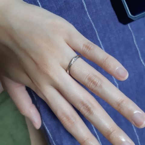 細いものを探しており、カーブしたものが良かったのですが、カーブしたものをいざつけてみると、あまり可愛くなく…店員さんがおすすめしてくださった、ちょっと変わった形のこの指輪、カーブではないですが、ダイヤがついていて少し下がった形がとても可愛かったです。