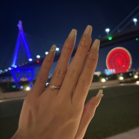 ダイヤモンドが中心に輝くデザインにしました。とてもキラキラしていて、一目見た瞬間に心を奪われました。繊細でかわいらしいデザインが指先を華やかにしてくれ、毎日眺めるたびに幸せな気持ちになります。彼女も喜んでくれました。