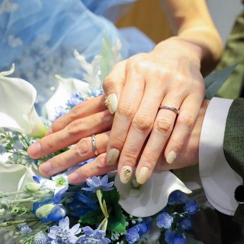 希望のデザインは普段つけていても目立ちすぎないようなシンプルなもので、素材はプラチナとゴールドのコンビを探していました。店頭で実際にみて、シンプルなデザインと、夫婦で共同で結ぶ作業は思い出に残ると思い、購入を決めました。夫婦で結ぶ作業をした際は、スタッフの方が写真を撮ってくださり記念になりました。