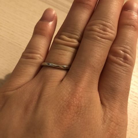 つけ心地がいいです。肌に馴染むような感覚です。つけ心地重視を考えて選んでよかったです。セミオーダーなので二人で特別な指輪を作ることができます。指輪の内側には自分の誕生石を入れてもらい、二人のイニシャルを刻印しました。