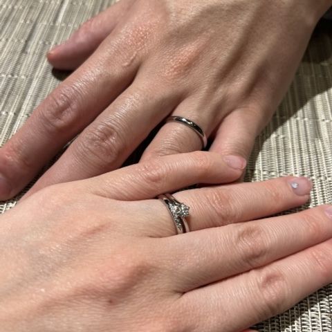 私はキラキラしすぎないけど少しポイントが欲しいという点、旦那はシンプルがいいという点で迷うことなく決まった指輪でした。 シンプルの中にもポイントがあるのが嬉しいです。 2人のイニシャルを入れようと思いましたが 文字数オーバーだったため、 そういう場合のパターンを教えていただき 私の指輪には旦那の名前、旦那の指輪には私の名前を刻印していただきました。