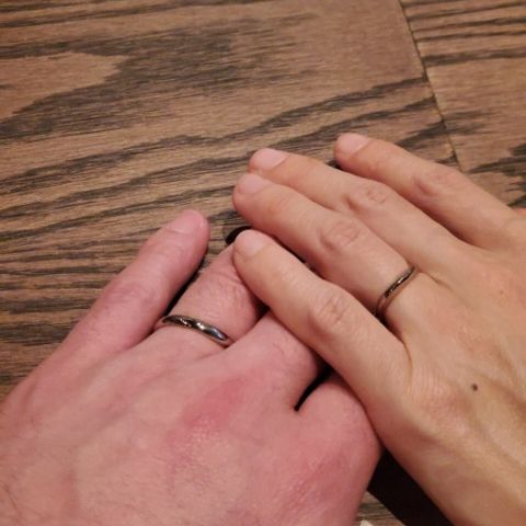 少し湾曲したデザインが可愛く、女性用にはダイヤもひとつ入れていただきました。ゴールドとシルバーで悩んでいたのですが、どちらにも見える色味を選び、とても気に入っています。普段からデザイン性のある指輪をつけることが好きなので、違和感なく馴染んでくれそうです。