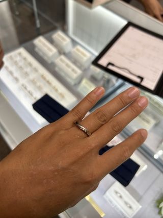 店舗にある指輪のデザイン豊富でどれにしようかとても迷いましたが、若い時だけでなく歳をとってもずっとつけていられるような指輪にしました。指が大きくなったらサイズ調整はちょっと難しいかも?というデザインですが、その時はまた買い直そうと思います。