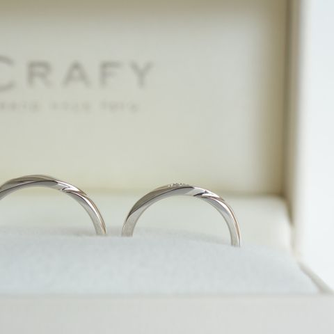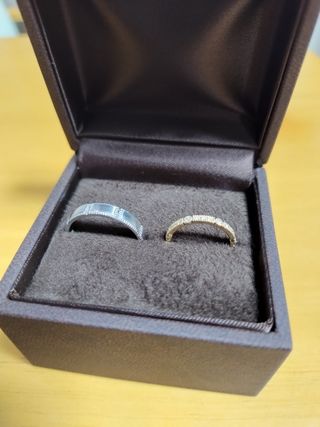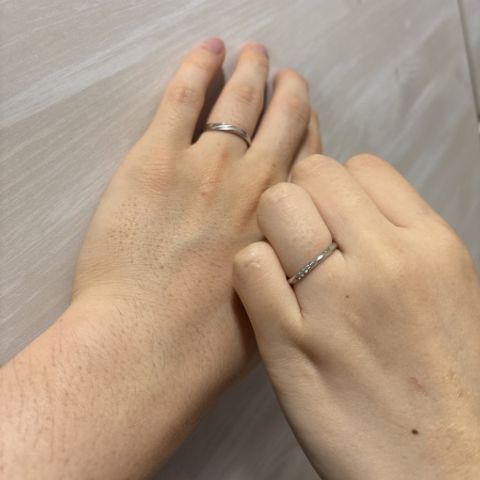 シンプルで飽きないデザインを選びました。 私はツヤツヤな仕上げですが、彼はヘアライン仕上げでそれぞれの好みに合わせて作れたのも魅力です。 婚約指輪は普段使いしかやすいように、ちいさなダイヤにしましたが、とても可愛く仕上がりました。
