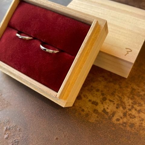 オーダーメイドで、直接職人さんとお話ししながら、色・形・加工など、1つ1つ決めていけたのがよかったです。表面を削って普通の指輪とは一味違う個性を出せたのも良かったです。ペアで色違いにしましたが、ひねりの加工を揃えたことでペア感を出せたのも良かったです。