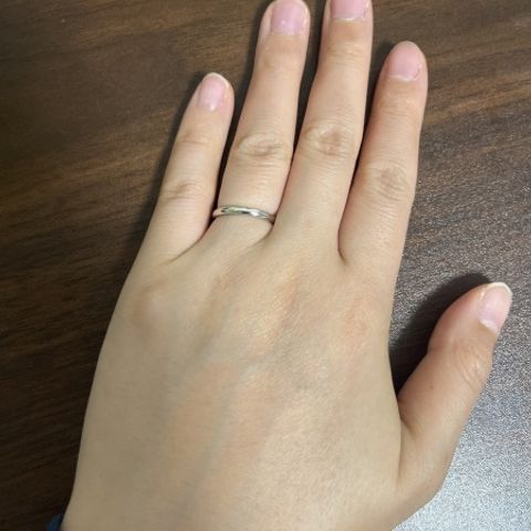 わたしの指は平均よりすこし細目なのでシンプルで細めの指輪にしました。 またストレートリングではなく、ウェーブのものでとても可愛いです。 指輪の真ん中にダイヤモンドがあしらわれているのですが、派手すぎに普段からずっとつけていられそう。