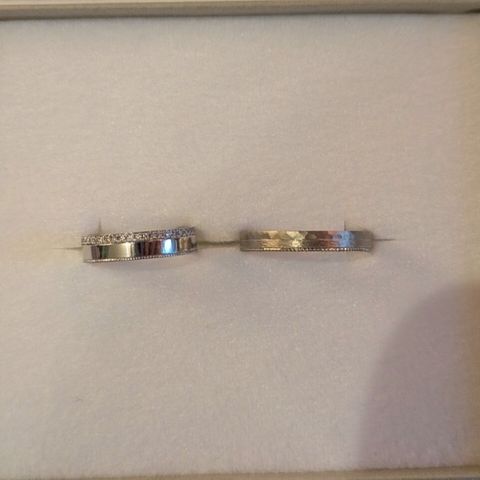 妻はプラチナ、私は肌馴染みのいいホワイトゴールドが良いとおもっていたので、それぞれ好きな素材を選びました。妻のダイヤが入る部分に、自分の指輪には鎚目を入れてもらい、二つの指輪のデザインに統一感もたせるようなデザインにしてもらっています。