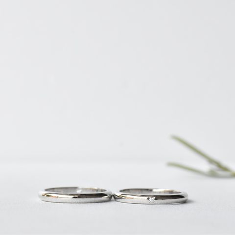 男性側は、シンプルな指輪にしました。女性側は、ダイヤの特徴が出るようにリングをシンプルにしました。指輪の内側には、入籍した日とお互いのイニシャルを刻印しました。また、店員さんから勧められて内側に希少価値の高いピンクダイヤを埋め込みました。