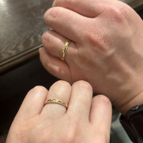 夫婦で指輪を製作する過程がとても楽しかった。ピンクゴールドと迷ったが、王道のゴールドにしてよかったとおもう。手作りならではの形状も自分らしさが出せるのでよかった。夫婦揃って指輪をつけたときに統一感がある。