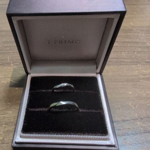 つや消し加工が上品な印象を与えてくれ、ダイヤモンドがさりげなく輝く特別なデザインにしてもらいました。夫と私、それぞれ好きなようにデザインを考えてもらいましたがペア感もあり、二人だけの指輪って感じでとても気に入りました。