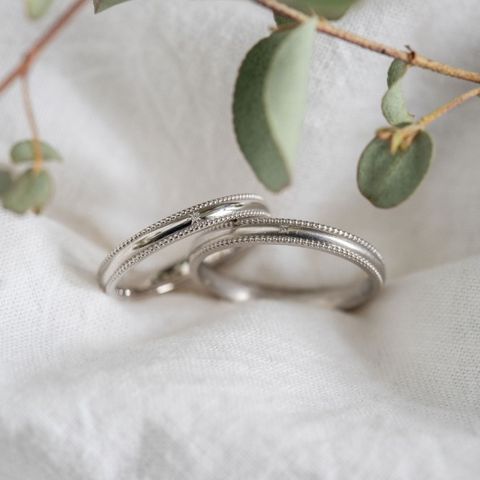 婚約指輪との重ね付けでも邪魔をせずに、職場でも付けることができるシンプルなデザインにしました。装飾を最小限に抑えつつも、表面の仕上げと縁取りの組み合わせによって、シンプルなのに印象深いデザインに仕上がっており、飽きが来にくく、長く愛用できると思います。