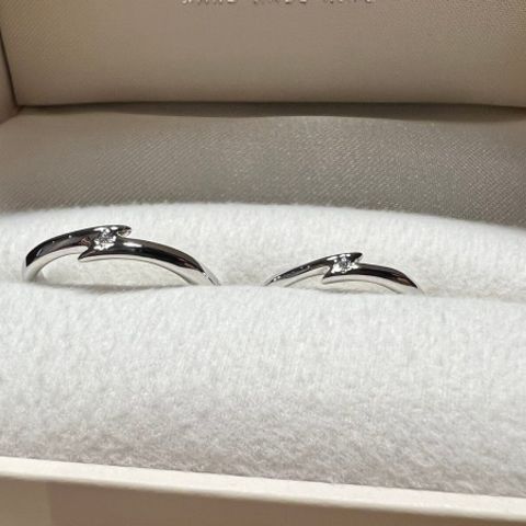 出雲結ブランドのひとつ、"時結"。婚約指輪と結婚指輪を重ね付けした際に完璧フィットするデザインです。女性用結婚指輪はダイヤが多く、0.5カラットの婚約指輪と相性がとても素敵な逸品です。男性用はマット仕様で落ち着いた雰囲気。私たち夫婦にぴったりな指輪でした。