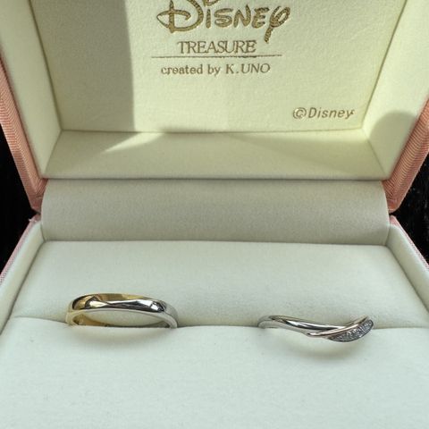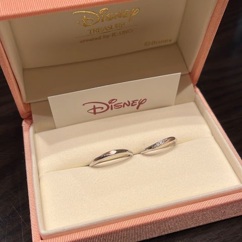 内側にディズニーキャラクターの刻印を入れました ディズニーデザインだと、世界観も細かくルールが決まっているようで、選んだディズニー作品の世界観を壊さずオリジナルリングが作れました 他のブランドに比べて、手が届き安い価格で 自分たちだけのリングが作れました