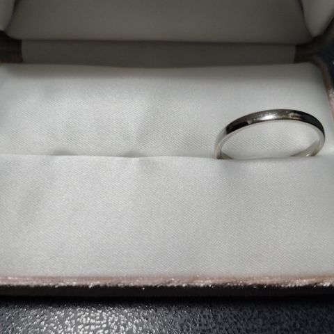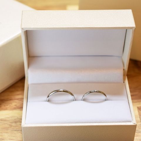シンプルなデザインで男性も付けやすく、クリアな形がとても可愛い。刻印も2人の思い出になるのでとても良い。 毎日付けるので飽きないデザインが良かったのもあり、2人とも満足している。プラチナとゴールド、太さも選べるので自分好みの指を作れるのがよかった。