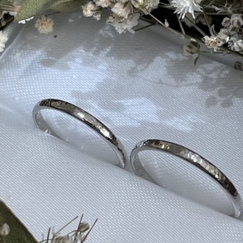 自分でデザインを考えられて、オリジナルの指輪が制作できました。槌目を自分で掘って、マットに仕上げてもらいました。片方にラインを入れてもらい、おしゃれな仕上がりになっていると思います。内側に誕生石が入っているのもポイントです。