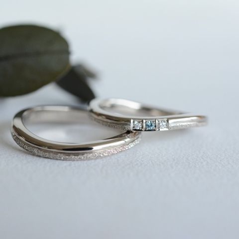 2人同じデザインにしながら、個々にこだわりたい部分を詰め込んだ指輪。 新婦は、ダイヤをたくさん付けたかったため、どこから見てもダイヤが見える数をつけた。 新郎は、趣味で使用する衣装の花を刻印し、ツヤ消しも2種類分けてこだわった