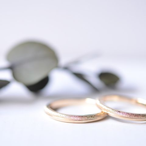 フルオーダーのため、デザインから表面の加工方法、号数や太さなど細かく決めることができました。加工のサンプルの中で見せていただいた「スターダスト」という加工に惹かれ、中央部分に入れていただき、ダイヤがなくてもキラキラとしたかわいい指輪になりました!