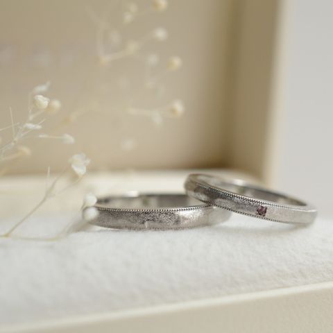 たまに、金属アレルギーが出る為、 プラチナてミルグレイン加工にしました。 指輪の裏には籍を入れた月のストーン、イニシャル、指紋を入れました! ワックス制作コースにてして、お互いの指輪の作り合いっこにしました 自分達で一から作った愛着ある指輪です。