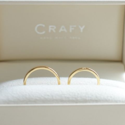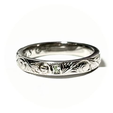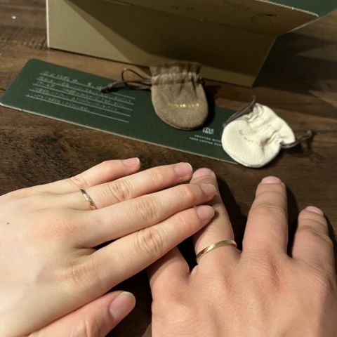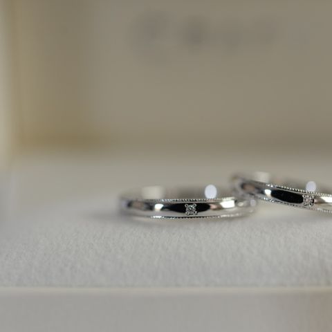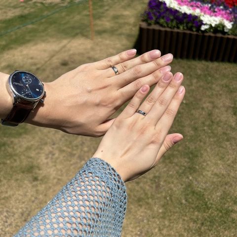 なるべくシンプルなデザインにしたいと考え、毎日どの服にも合うようにしました。表面はワンポイントのダイヤだけにして、二人にしかわからないよう内側にお互いの誕生石と名前を入れました。自分に合う細さにもこだわりたかったので、幅も0.1mm単位で調節できたのが嬉しかったです。着け心地が良くて気に入っています!