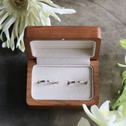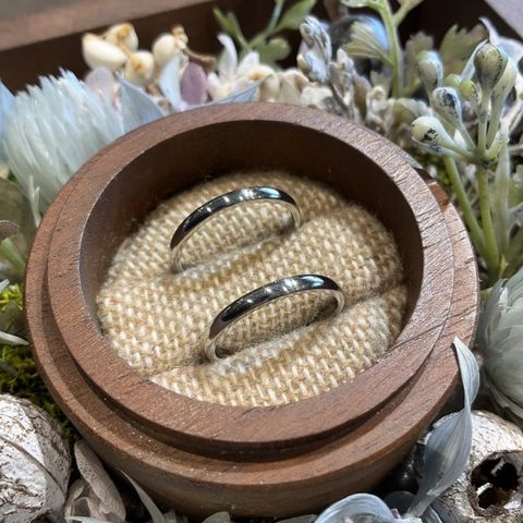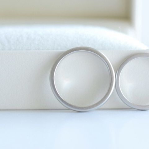 艶消し加工にこだわりがあり、いくつかの種類の中からホーニング仕上げにしたのですが、とても気に入っています。艶消しは定期的にメンテナンスをしないと加工が取れるとも聞いていたので、事前に問い合わせてメンテナンスができることを確認し、このお店を選びました。シンプルなデザインですが、長く身につけるものなので、細かいこだわりを反映させて自分たちらしいデザインにできたのが本当に嬉しいです。