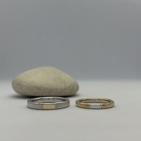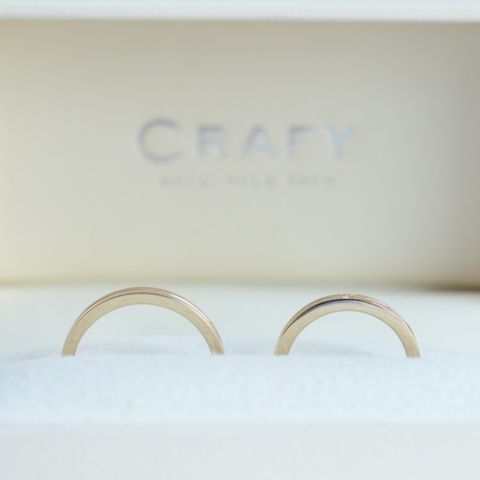 デザインはお揃いにしましたが、加工や太さを自分好みにアレンジすることでお互い自分のこだわりが詰まった指輪になりました。 内側の刻印や石の種類も豊富で、自分たちだけの特別感があります。 また、2人らしさと飽きないデザイン大事にしたく、 表はカーブ、反対はシンプルなリングで両方楽しめる指輪を作りました。