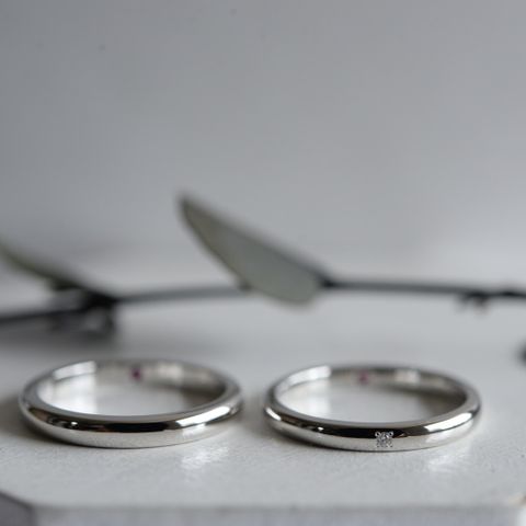 プラチナの指輪にしたかったのでプラチナ900に。デザインはシンプルにしたかったので鏡面仕上げにしました。見た目はシンプルな指輪ですが、指輪の内側にお互いの誕生石と入籍月の石を入れた事で、2人の想いのこもった指輪になりました!