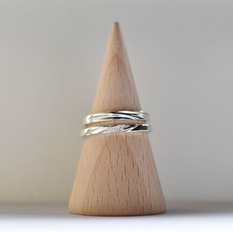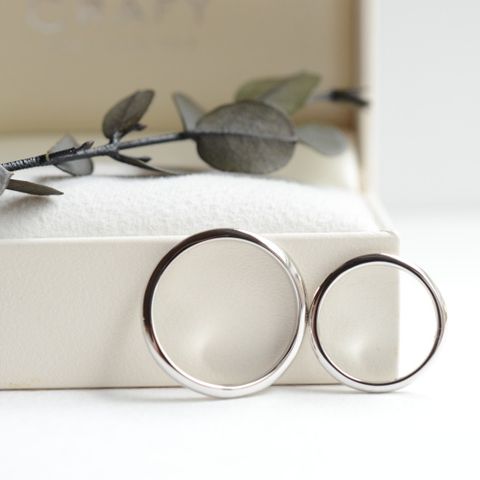 2人の好みが違ったので、デザインと形だけは同じにしてテクスチャーと素材はそれぞれ好きなものを選びました。 テクスチャーを切り替える斜めに入れた線がスタイリッシュで気に入ってます。着け心地にもこだわり、試作品では平打ちだったのを角丸にしたのも良かったです。