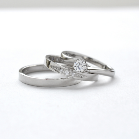 パートナーの婚約指輪と結婚指輪は重ね付けが出来るようにデザインし、二人の結婚指輪はデザインに統一感を持たせました。着用時のイメージが想像よりもよく、ブランド鍛造製法なので長持ちするため安心して着用できます。