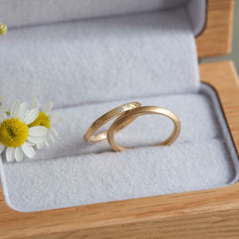 フリージアのデザインをベースに作成していただきました。 ねじれ部分を境に色を変えた2色のリングで、メンズとレディースで色が反対になっています。 また、ねじれ部分以外に鎚目を入れていただき、どの方向から見ても可愛く、色もデザインも2通り楽しめるリバーシブルのようなデザインがとても気に入っています! レディースはダイヤモンド1ピースを星彫りの縁で入れていただき、控えめな煌めきが美しく、つい眺めてしまいます。 指輪の内側には2人とも結婚記念日を手彫りで入れていただきました。温かみがあり、これもまたじっくりと眺めたくなります。