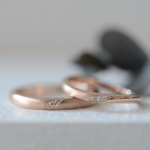 素材は結婚指輪、婚約指輪ともにK18ピンクゴールドにしました。結婚指輪はどちらもマット仕上げで日常で傷など気にせず使いやすい仕上げにしました。デザインは甲丸と平打でお互いに気に入ったデザインにしました。婚約指輪は特別感のあるクリア仕上げでデザインは平打、ダイヤを8個埋め込み加工にしました。