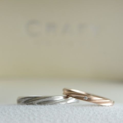 来店した日が、デザイナーさんが店舗にいらっしゃった日で、直接デザイナーさんとお話しながら作ったデザイン。わざとうねりを入れてみたり、新婦側の指輪の色を肌の色に合うように変えたりと、自分たちのこだわりを詰められたフルオーダー指輪です。