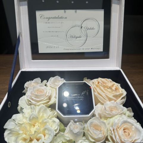結婚指輪のデザインに合う婚約指輪をサプライズ製作!重ね付けしやすいデザインなので普段使いでもフォーマルな場でも良い意味で馴染んで、存在感もバッチリ◎オシャレに使いこなせています♪キラキラ輝く高級感あるダイヤが憧れの婚約指輪を実現させてくれていて、お気に入りです。手書き刻印の夢も叶えてくださり、唯一無二の一生の宝物です。